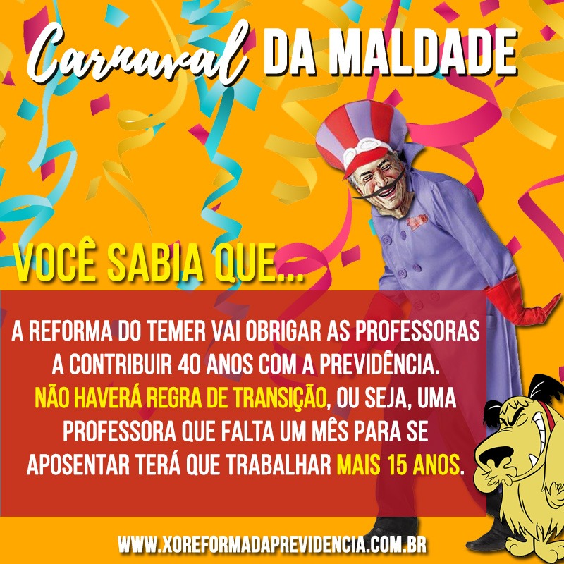“A reforma de Temer vai obrigar as professoras a contribuir 40 anos com a Previdência. Não haverá regra de transição, ou seja, uma professora que falta um mês para se aposentar terá que trabalhar mais 15 anos”, exemplifica outro material.