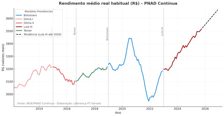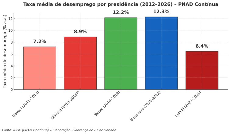 A assessoria técnica do PT no Senado aponta que o terceiro governo Lula deverá apresentar a menor taxa média de desemprego – 6,4% – desde 2012, quando os dados começaram a ser relacionados pelo Instituto Brasileiro de Geografia e Estatística (IBGE). Do início de 2023 até o último mês de setembro, o rendimento médio real dos brasileiros subiu 9,7%, passando de R$ 3.198 para R$ 3.507, também batendo recorde da série histórica, segundo o IBGE.