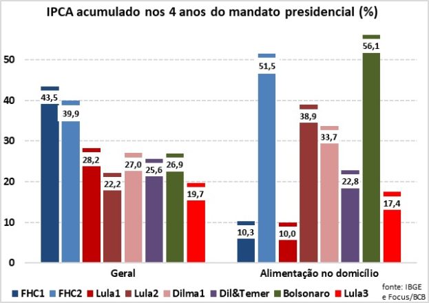 Os técnicos reuniram também a inflação aplicada aos alimentos durante o mesmo período. Devido à vulnerabilidade em relação ao clima, os alimentos têm índice com maior variação, mas é também notável a redução conseguida no terceiro mandato do presidente Lula em relação ao governo Bolsonaro: de 56,1% para 17,4%. A vitória é passível de maior comemoração quando se recorda que foi recente a saída do Brasil do Mapa da Fome, feito também alcançado no primeiro mandato do petista, quando a inflação dos alimentos foi reduzida de 51,5% para 10%.