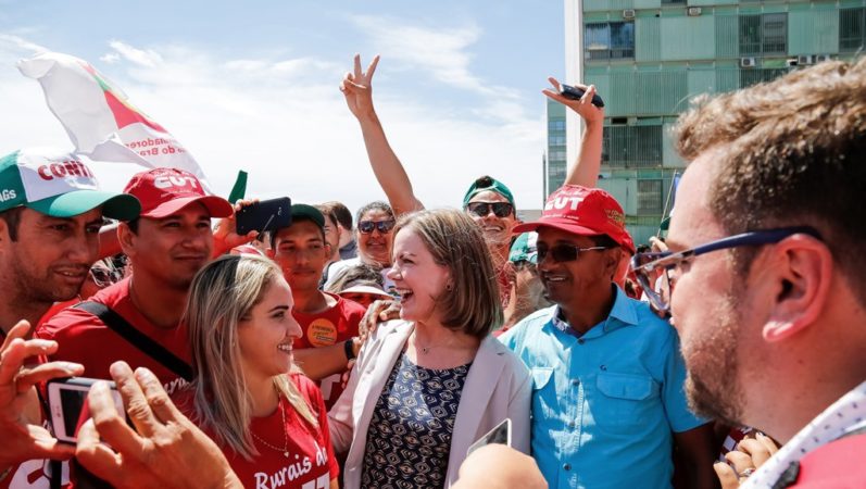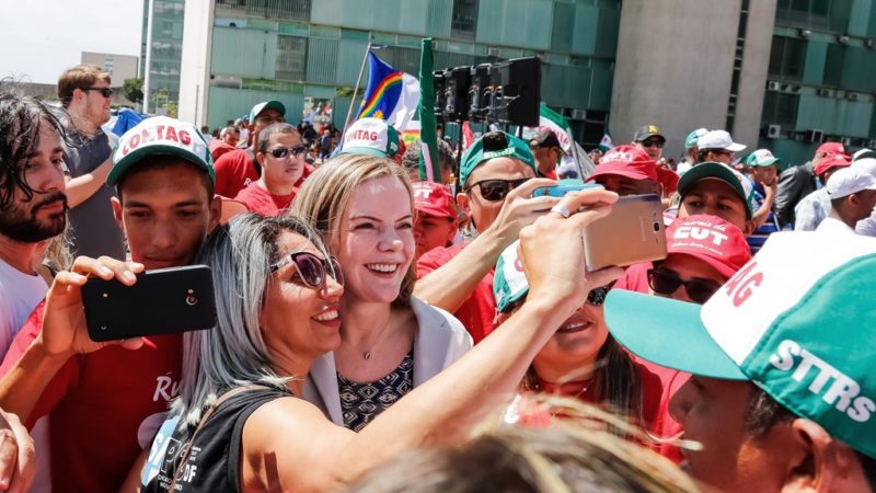 Senadora Gleisi Hoffmann na Greve Geral, em Brasília, no dia 15. Foto: Alessandro Dantas