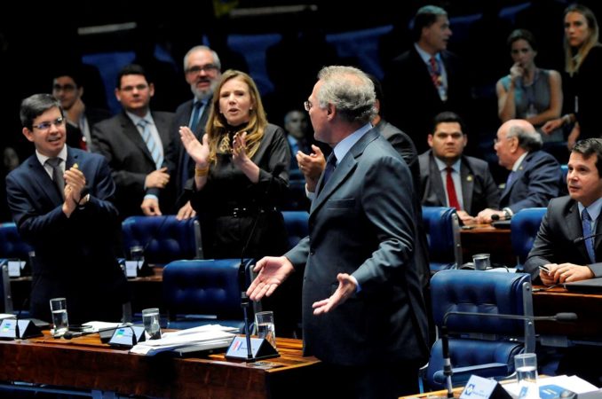 Senadores aplaudem líder do PMDB, senador Renan Calheiros (PMDB-AL), após pronunciamento criticando posição do governo sobre reforma da Previdência. Foto: Alessandro Dantas