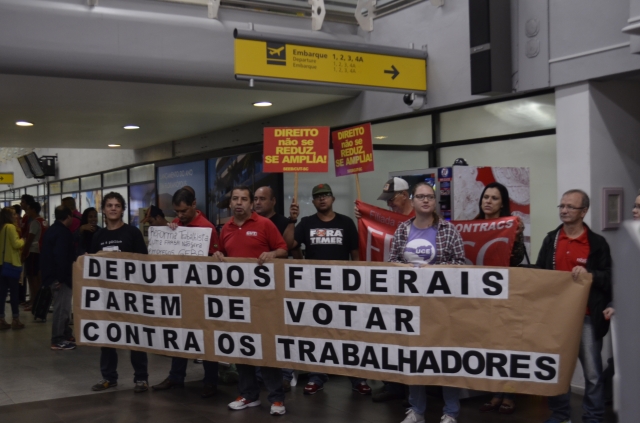 No Aeroporto Internacional de Fortaleza (CE), sete parlamentares foram abordados por manifestantes. O evento começou ainda na madrugada desta terça-feira (18) e incluiu distribuição de panfletos com explicações sobre os retrocessos promovidos pelas reformas.